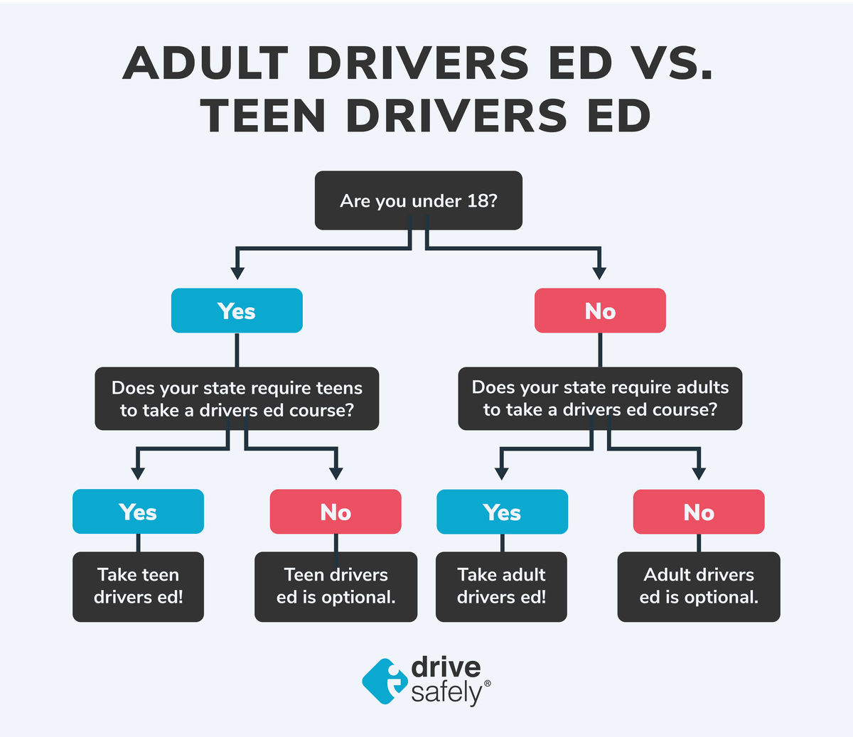 This is a pretty simple choice as it’s based on what state you live in and how old you are. You’ll need to check what the drivers license requirements are in your stateJTC Documents Studies Driver%20Education_Beth SummaryStateTable.pdf Leg.wa.gov. If you are younger than 18, you’ll need to take teen driver’s ed (if your state requires it). If you are over 18, you would choose adult drivers ed (if your state requires it).